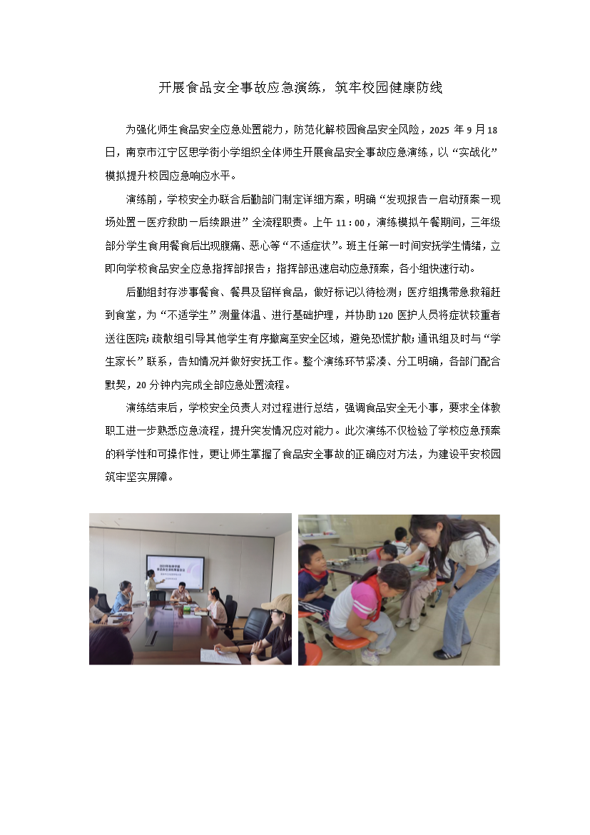 师生健康 中国健康|江宁区思学街小学开展2025年秋季学期食品安全事故应急演练,筑牢校园健康防线